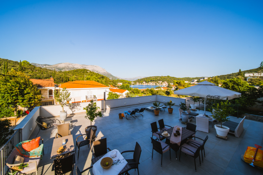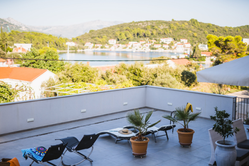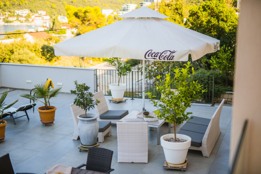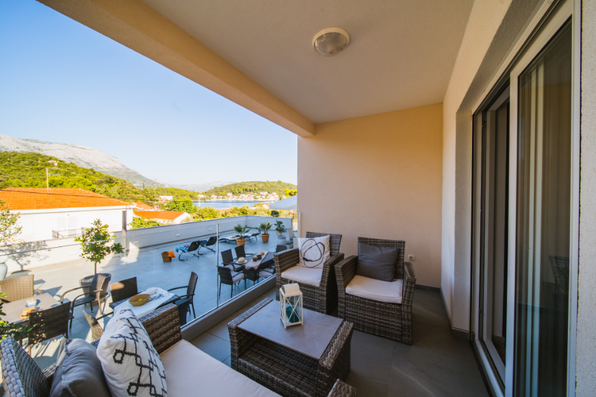 - Apartman od 40m2 sa 1 spavaćom sobom, kupaonicom, kuhinjom, blagavaonicom, dnevnim boravkom i natkrivenom terasom od 10 m2 sa pogledom na more