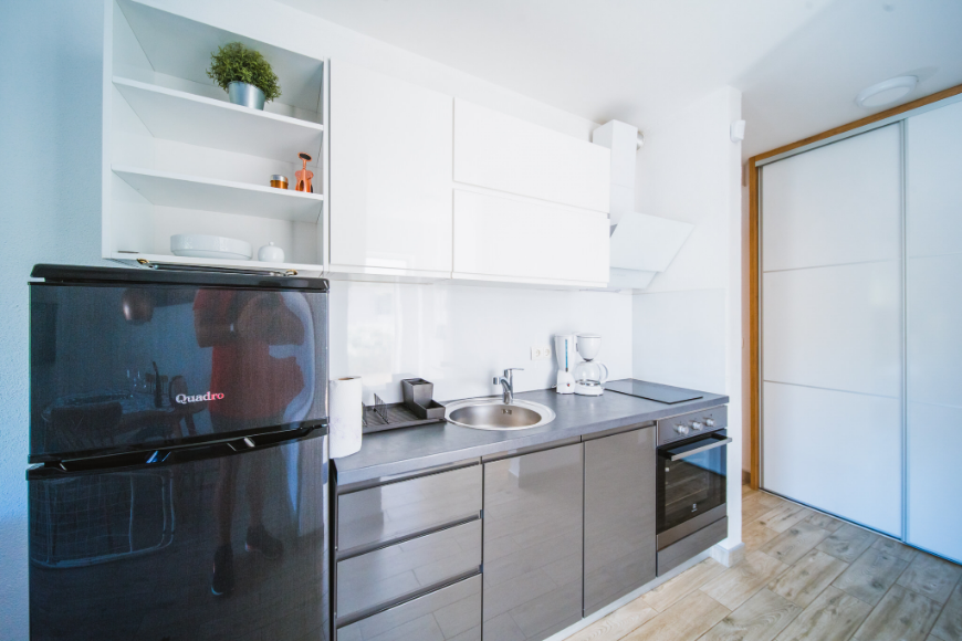 - Kuhinja: kompletno posuđe sa sredstvima za održavanje, perilica posuđa, pećnica, ploča za kuhanje, kuhalo za vodu, toster, frižider 165 L sa zamrzivačem