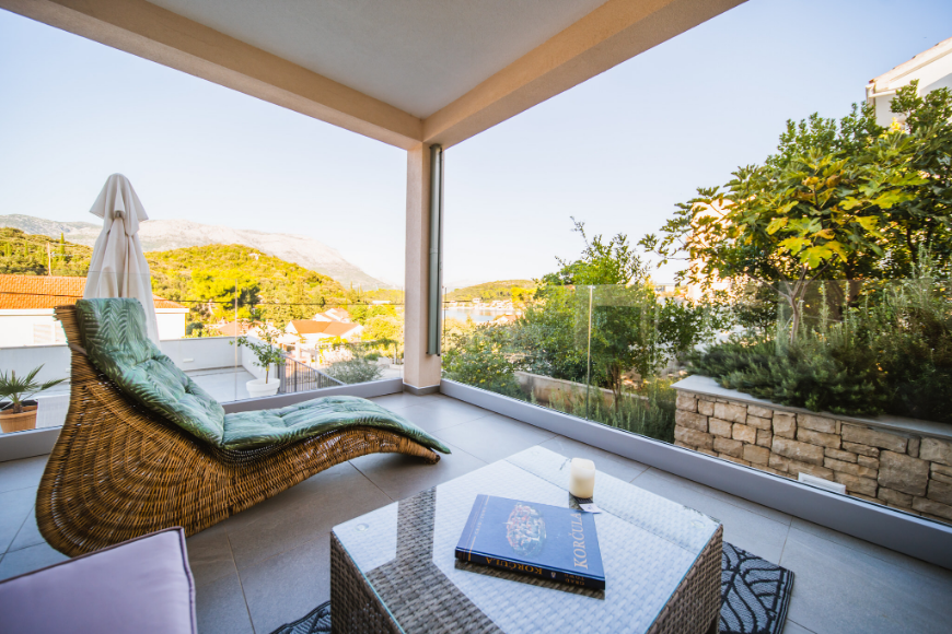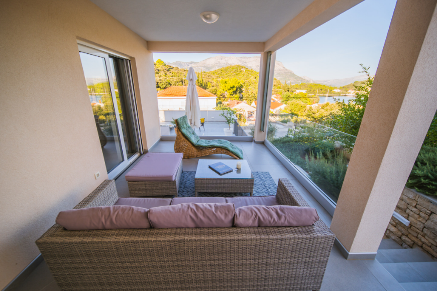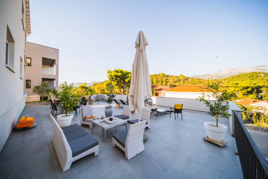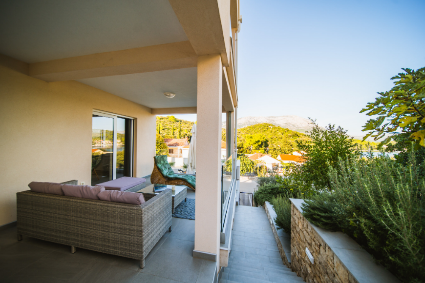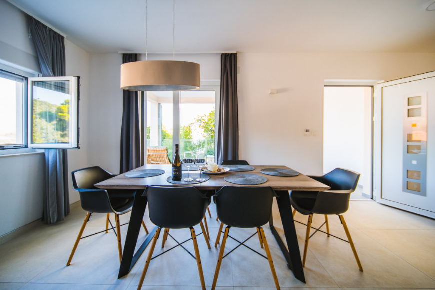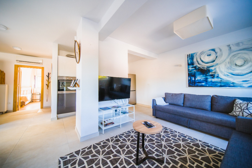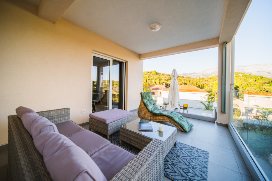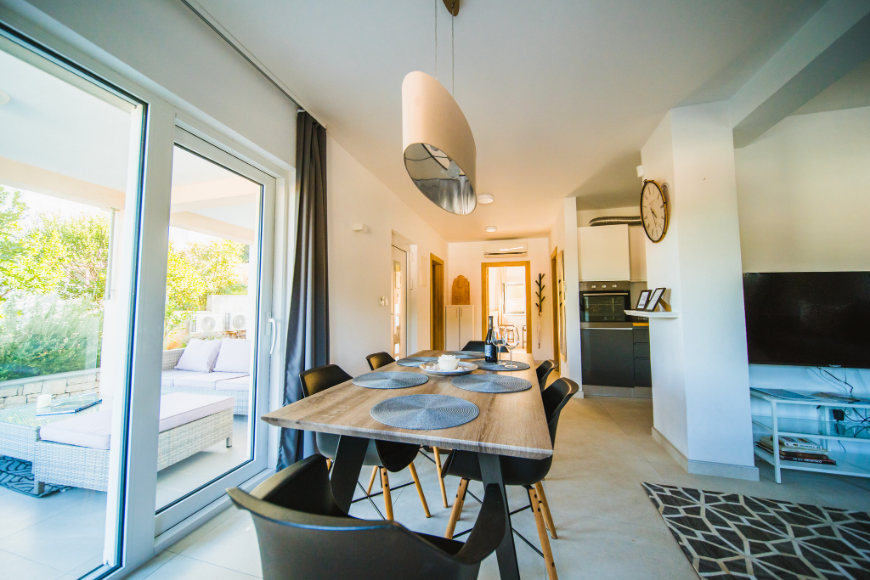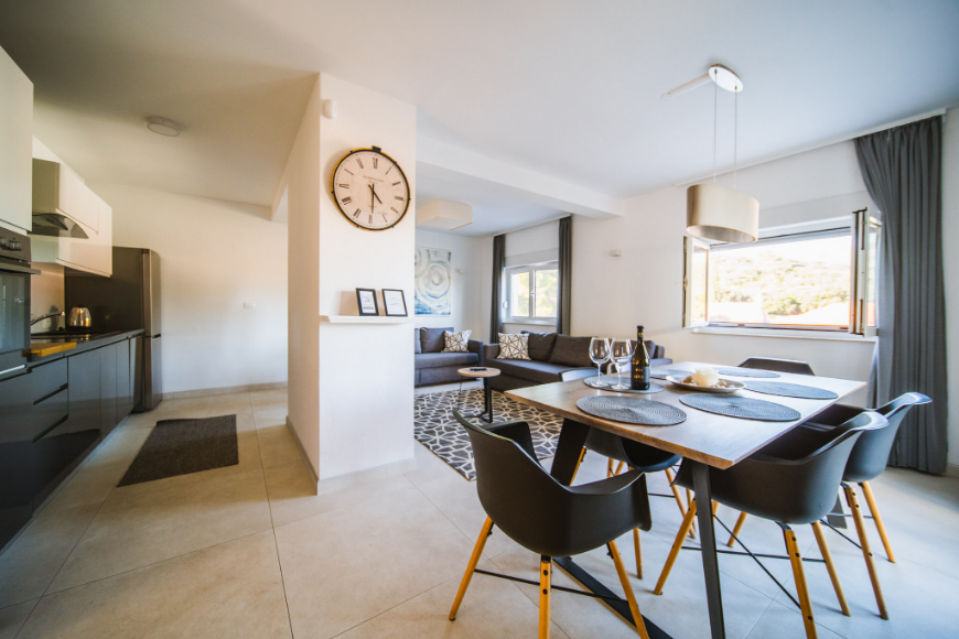 - Apartman od 75m2 sa 2 spavaće sobe, kupaonicom, kuhinjom, blagavaonicom, dnevnim boravkom i natkrivenom terasom sa pogledom na more