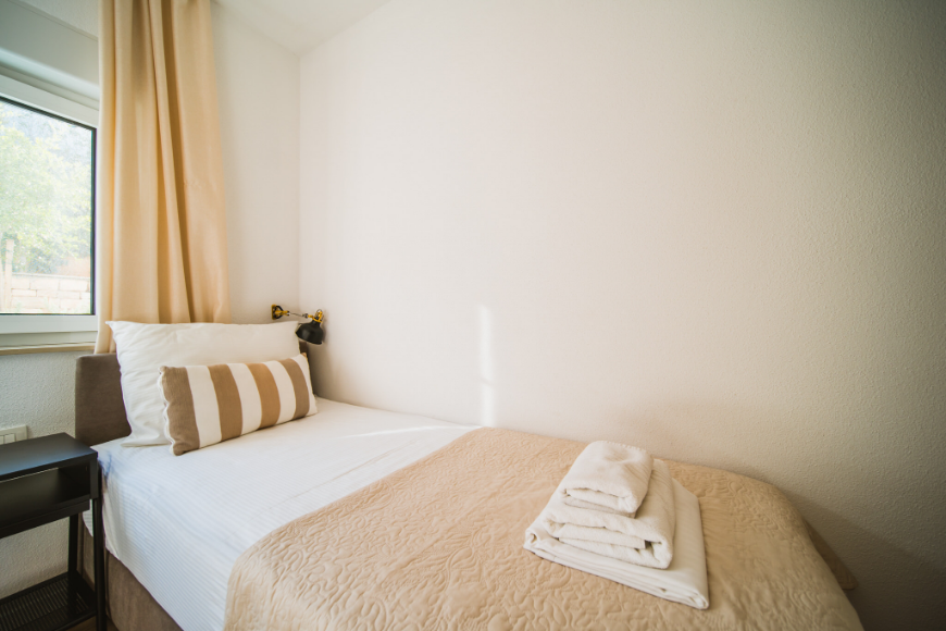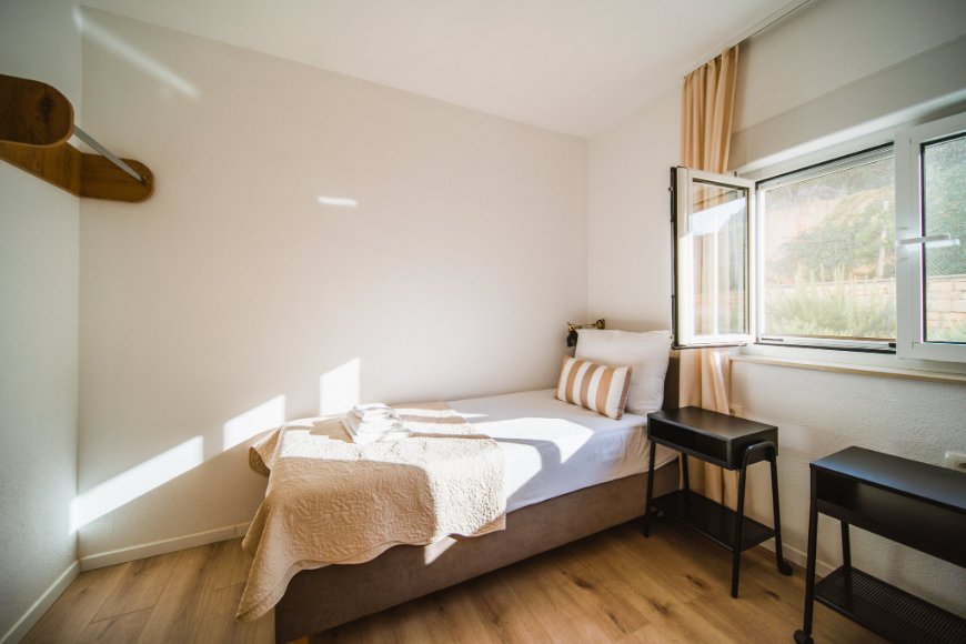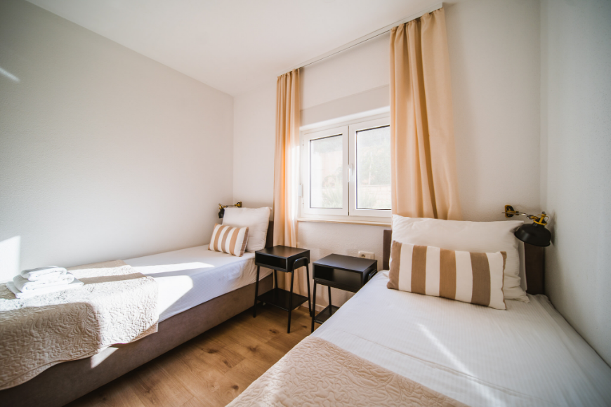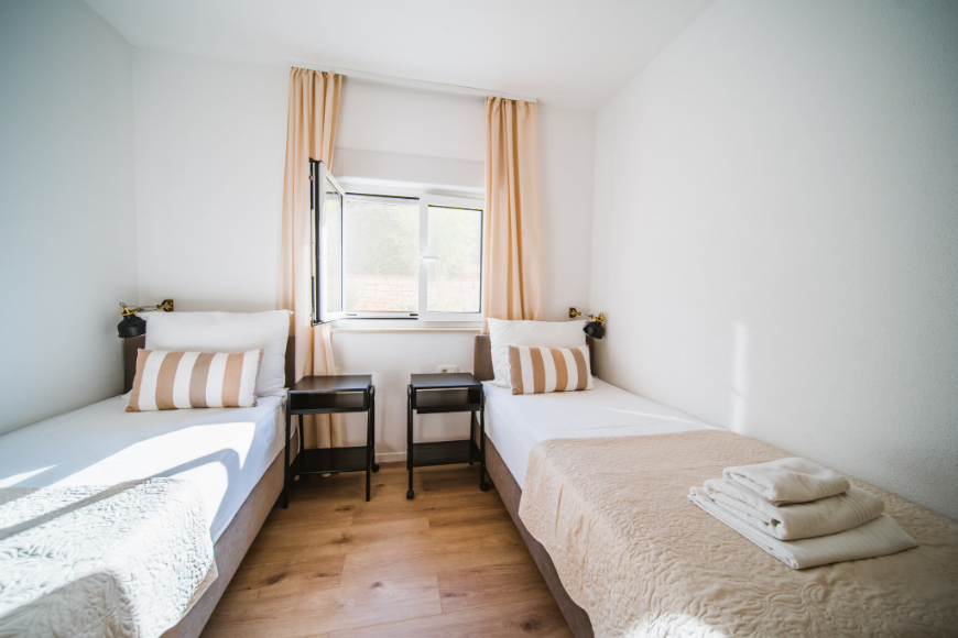 - 1. Spavaća soba: bračni krevet 180 cm (kreveti mogu biti odvojeni), ormar, toaletni stol
