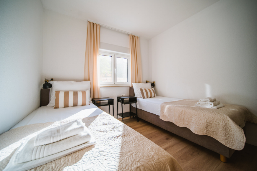 - Ležaji: bračni krevet u spavaćoj sobi x 2 + 2 ležaja na razvlačenje u d.boravku (napomena: svi ležaji mogu biti odvojeni)