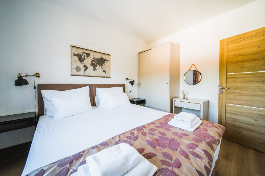 - Spavaća soba: bračni krevet 180 cm (kreveti mogu biti odvojeni), ormar, toaletni stol
