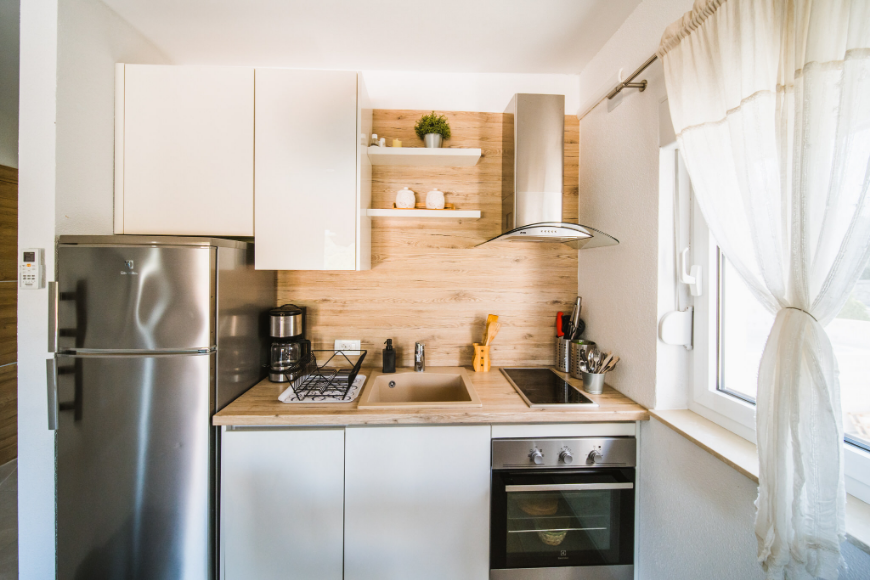- Kuhinja: kompletno posuđe sa sredstvima za održavanje, perilica posuđa, pećnica, ploča za kuhanje, kuhalo za vodu, toster, frižider 165 L sa zamrzivačem