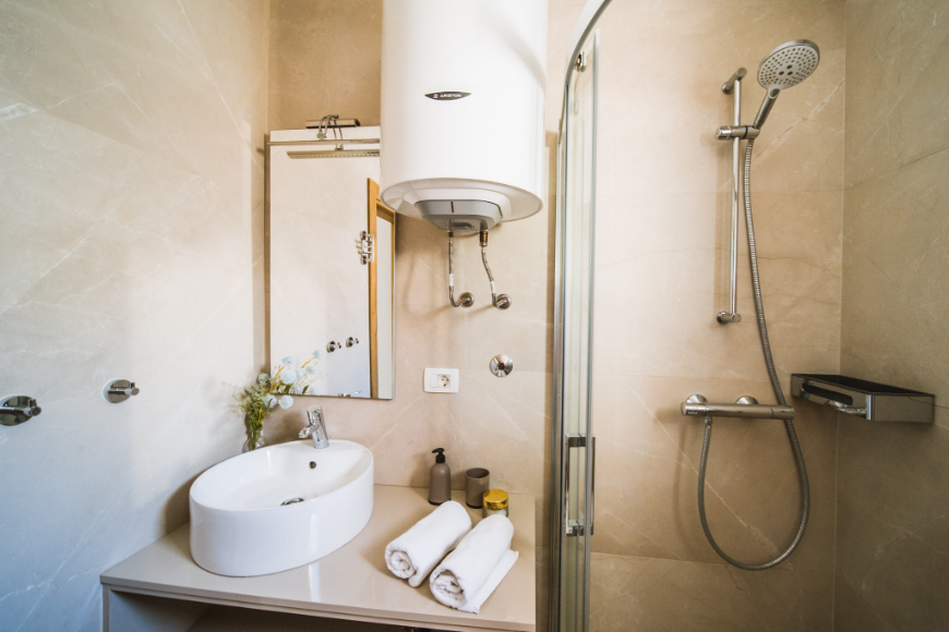 - Apartman od 40m2 sa 1 spavaćom sobom, kupaonicom, kuhinjom, blagavaonicom, dnevnim boravkom i natkrivenom terasom od 10 m2 sa pogledom na more